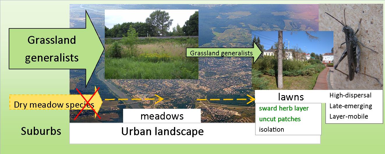 Orthoptera are often surveyed in research on urban environments, but results are ambiguous in different regions and cities. We studied the insects in a city located in the centre of the East-European plain, at the junction of the Continental and Boreal biogeoregions. We distinguished suburbs and the urban landscape and meadows and lawns within the urban landscape. To find orthopterans in grassland habitats, we used sweepnet, acoustic and visual observations, and pitfall traps. Urban habitats are colonised by 20 species of Orthoptera from 29 species observed in the suburbs. Only five species are as frequent in urban habitats as in suburban ones. The urban environment negatively affects both forest species, all three species of dry meadows and only one of ten grassland generalists. On lawns, we found 11 species. Total abundance and species numbers were lower in lawns than in meadows. Only three late-emerging and high-dispersing species were quite frequent in lawns. The occurrence of Conocephalus fuscus in lawns was positively influenced by the presence of uncut patches, Chorthippus dorsatus—by the density of the herb layer. Ch. mollis, which is native to dry meadows, preferred unshaded lawns. Chorthippus biguttulus is a single species inhabiting lawns of almost every quality.