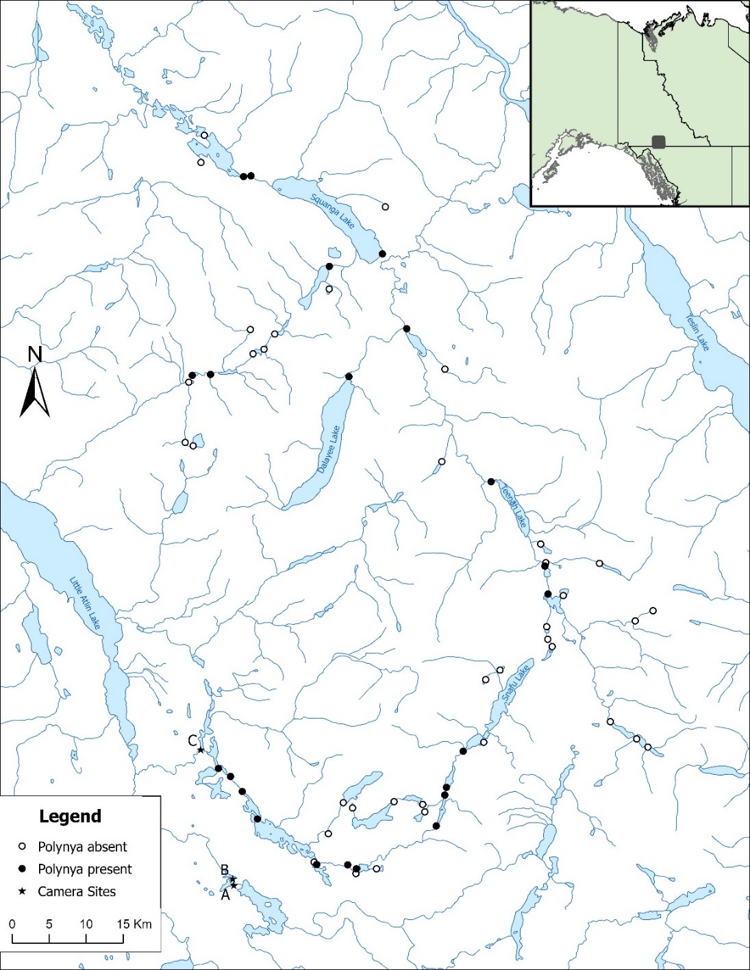 Patches of open water (polynyas) persist throughout six-month winters on many ice-covered lakes in boreal mountain ecoregions of northwestern North America. We explored their distribution, hydrological correlates, and the diversity of species using them from freeze-up to break-up. In headwater drainages, lakes with outflow polynyas were significantly larger than those without, but many small lakes also had polynyas. There was a consistent threshold in upstream catchment size below which outflow polynyas were absent and above which they persistently occurred in downstream lakes. Outflow polynyas depend on winter-long through-flow of water, likely maintained by the hydraulic head of higher elevation ground water in perched water tables in this region of very limited permafrost. Based on camera trapping, two species, the American dipper and river otter, used polynyas heavily throughout winter foraging. Polynyas likely provided crucial forage for at least 9 species of migratory waterfowl (Anatidae) to complete their spring migration or to prepare for reproduction on local lakes. Cameras recorded additional 5 bird and 11 mammal species, as foragers, scavengers, or incidentally. We report previously undocumented significance of these spatially-limited and seasonal polynya ecosystems in expanding the diversity of winter ecological opportunity for numerous species on small to medium-sized lakes.