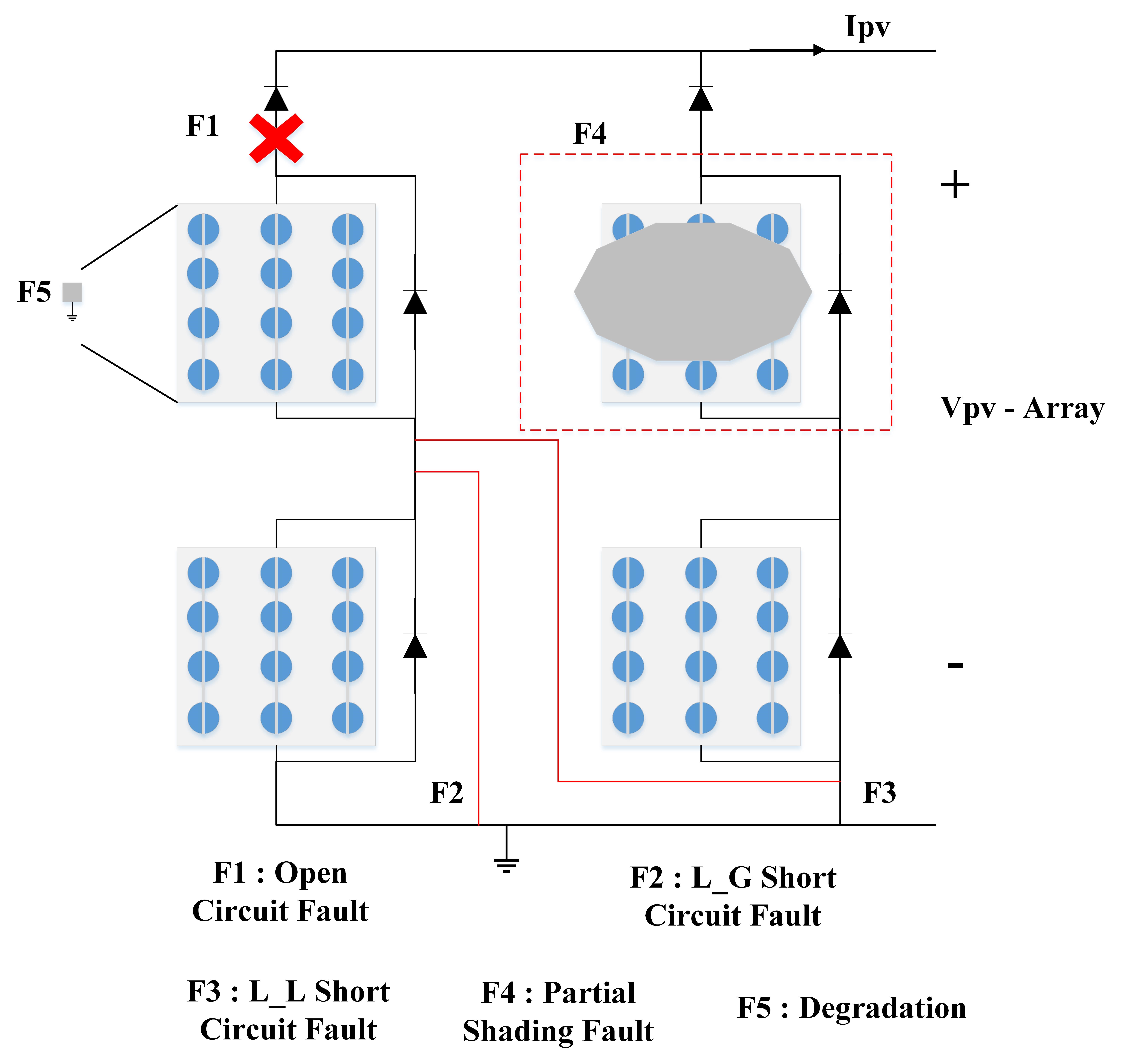 Four main types of faults can occur at the DC side of any Photovoltaic System (PVS). These faults are quite dangerous and can cause permanent damage to the photovoltaic modules if not addressed promptly. The faults include open circuit, short circuit, degradation, and partial shading. Short circuit faults are classified into line-to-line (L-L) and line-to-ground (L-G). Detecting these faults requires specialized algorithms. This paper tackles this complex issue through (1) fault-finding equations and the placement of current sensors, and (2) a new hybrid algorithm based on data from the fault-finding equations and current sensors. Numerous simulations using PSIM 2021 were conducted to verify this proposed solution. The hybrid algorithm presented here is original compared to previous studies. It is easy to understand, responds quickly, and can be implemented in systems with photovoltaic arrays of any size.