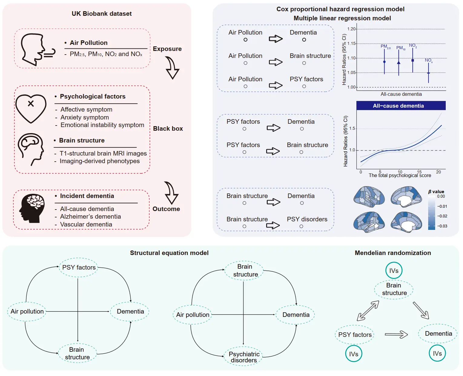 Exposure to air pollution contributes to increased dementia risk, which may be mediated through its impact on psychological and brain structural changes. However, the underlying mechanisms remain poorly understood. We analyzed data from the UK Biobank of 263,095 participants aged 40 years and older. We examined the association between air pollution and incident dementia using Cox proportional hazard regression models. Mediation analysis was performed to explore the mediating roles of psychological and brain structural factors on these associations. Structural equation model (SEM) and bidirectional Mendelian randomization (MR) analyses were further employed to explore the potential pathways involving psychological factors and brain structure in this relationship. During an over 13-year follow-up, a total of 3039 dementia cases were identified. We observed significant associations between air pollution and dementia, with each interquartile range (IQR) increase in air pollution associated with a 5~9% increased risk of dementia. We observed that both psychological and brain structural factors mediated the air pollution-dementia association, particularly loneliness, social isolation, lack of enthusiasm, and reductions in volumes of the amygdala, hippocampus, temporal pole, and frontal pole, with mediation proportions ranging from 4.23% to 11.11%. SEM and MR analyses revealed bidirectional pathways linking air pollution exposure to dementia through psychological factors and brain structural changes: (1) air pollution → psychological disturbances → brain structural damage → dementia; (2) air pollution → brain structural damage → psychiatric disorders → dementia. These findings elucidate the interplay between psychological well-being and neuroanatomical integrity in mediating the neurocognitive impacts of air pollution, offering insights for targeted interventions to mitigate dementia risk associated with environmental exposures.