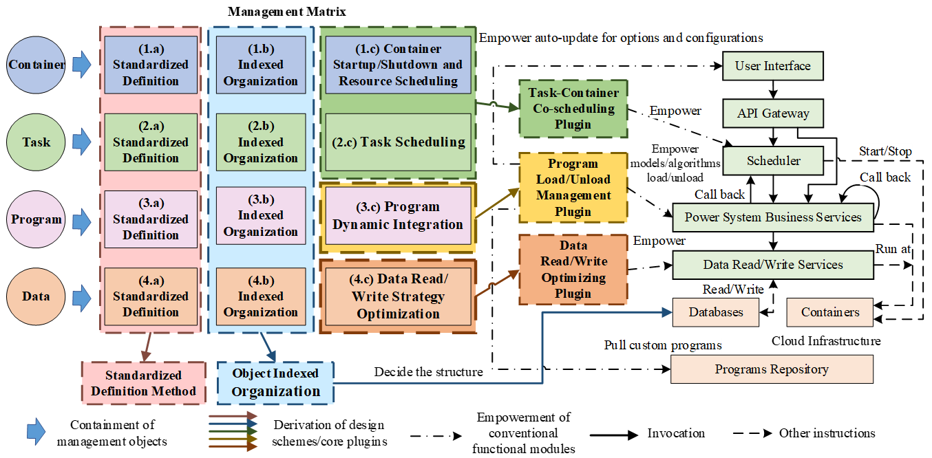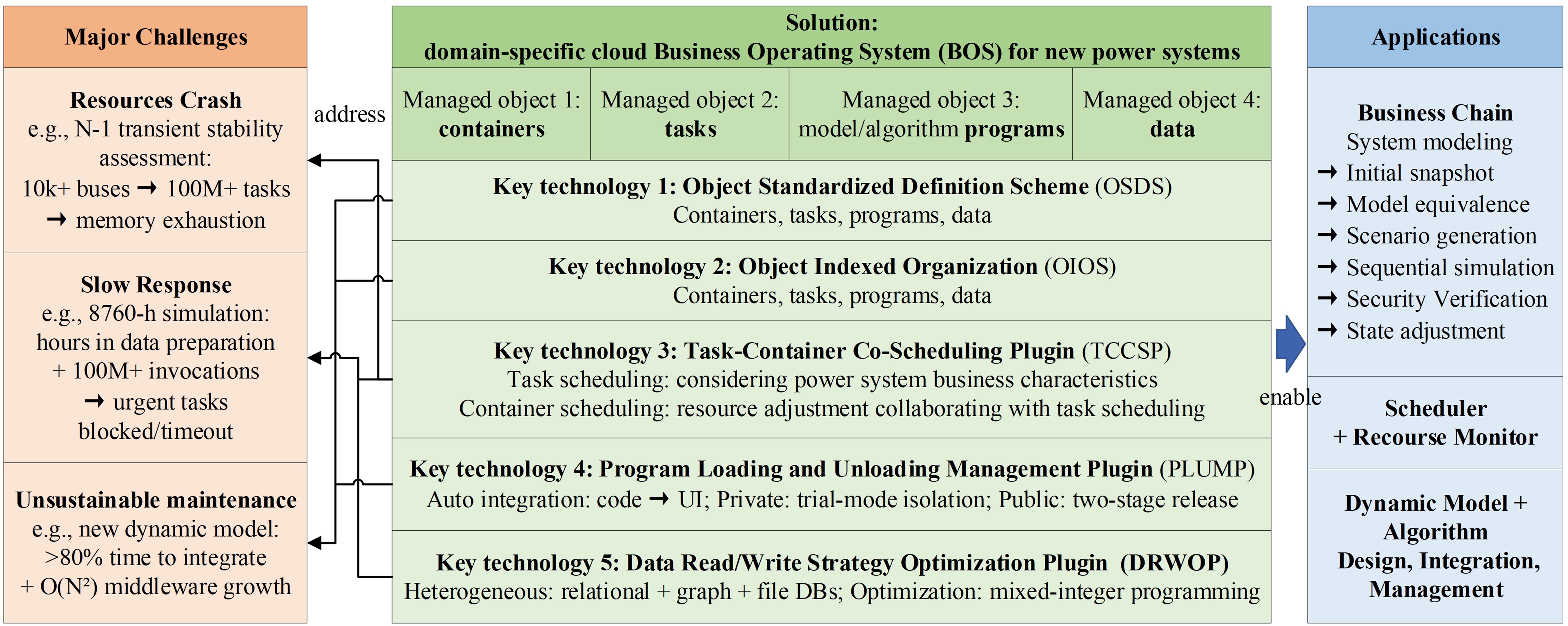 The deep digitization of power system business faces three major challenges: computational resources are prone to crashes, business response is slow, and platform maintenance is unsustainable. To address these issues, this paper proposes a domain-specific cloud Business Operating System (BOS) for new power systems. BOS establishes a unified management paradigm for four core digital objects—Containers, Tasks, Programs, and Data—through their standardized definition and indexed organization. Building upon this foundation, it implements three dedicated plugins to enable synergistic task-container co-scheduling, plug-and-play program integration, and optimized data access. This paper elaborates on BOS’s architecture and its rationale as an operating system, detailing the key technologies for object management. Case studies on a real-world regional power grid demonstrate that BOS effectively ensures the efficient execution of large-scale computational tasks, supports the agile integration of domain-specific models and algorithms, achieves seamless and efficient data connectivity across business chains, thereby providing a robust foundation for next-generation power system digitization.