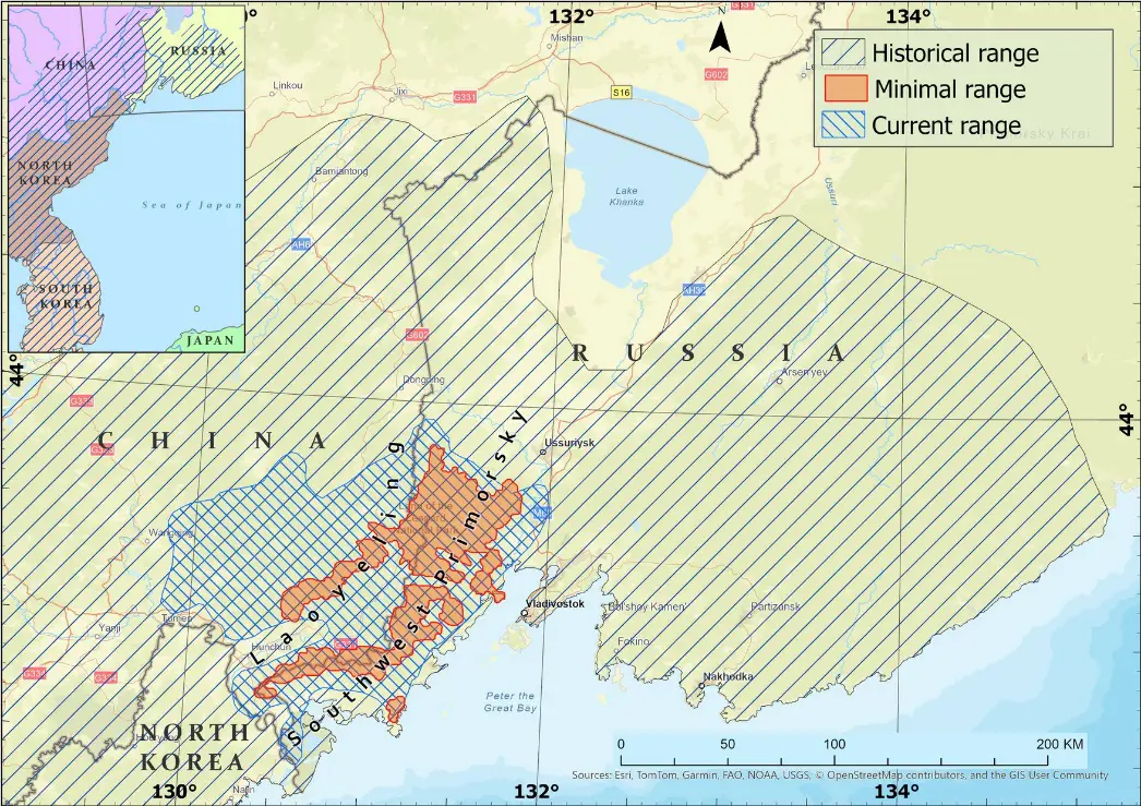 The last Far Eastern leopards survived at the junction of the Southwest of Primorsky Krai in Russia and the Laoyeling-Dalongling in Jilin and Heilongjiang provinces in China. By the year 2000, there were only 30–35 individuals living in an area of approximately 3000 km2. Thanks to conservation efforts, this endangered subspecies has moved away from the edge of extinction, with more than 150 individuals living in an area over 14,000 km2 in 2022. Reliable protection of key habitats has played a crucial role in this success. Over the past 25 years, the transboundary network of protected areas dedicated to the conservation of the Far Eastern leopard has increased 12 times, from 1532 km2 to 18,961 km2, covering 12,636 km2, or 90 percent of its current range. The latest step was the proclamation in 2024 of the Sino-Russian transboundary protected area “Land of Big Cats”. This includes the Kedrovaya Pad Nature Reserve, the Land of the Leopard National Park with a buffer zone in Russia (3694 km2), and the Northeast Tiger Leopard National Park in China (14,612 km2). According to our estimates, this will ensure the long-term preservation of 17,239 km2 of suitable habitats, which will allow for the maintenance of a potential population of at least 300 Far Eastern leopards.