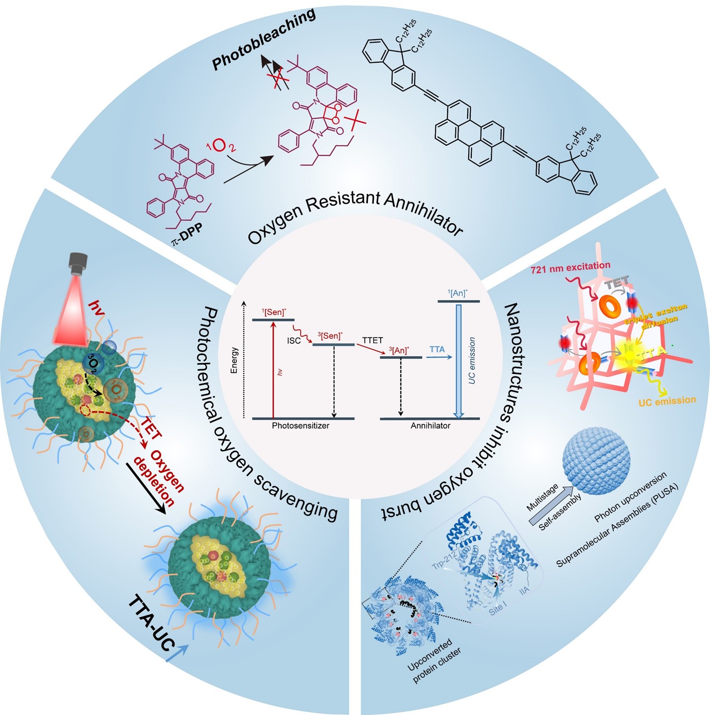 Triplet–triplet annihilation upconversion (TTA-UC) is an emerging class of photonic upconversion materials notable for low excitation power thresholds, high upconversion quantum yields, and tunable absorption and emission profiles. These unique features give TTA-UC materials significant potential across diverse fields such as chemistry, biology, and materials science. A typical TTA-UC system consists of sensitizers and annihilators, functioning through a sequence where the sensitizer absorbs photons and transfers triplet energy to the annihilator via triplet–triplet energy transfer, followed by triplet–triplet annihilation (TTA) that emits higher-energy photons. Because TTA-UC materials can be excited by long-wavelength light, they overcome the limitations in penetration depth of conventional fluorescence technologies, showing great promise for applications such as deep-tissue imaging, targeted photodynamic therapy, and precise optogenetic modulation. However, molecular oxygen causes non-radiative decay pathways that severely quench upconversion efficiency, posing a major challenge for practical use. Over the past decade, researchers have developed various innovative strategies to counteract oxygen-induced quenching. This review systematically summarizes key scientific approaches to creating high-performance, oxygen-tolerant TTA-UC materials, with a focus on their underlying mechanisms. First, we discuss molecular engineering strategies involving electron-deficient groups and conformational control to improve the photostability of TTA-UC chromophores. Second, we describe the fabrication of oxygen-resistant TTA-UC nanoparticles using reductive oil droplets as soft templates. Finally, we discuss nanostructure-mediated optimization of intermolecular triplet energy transfer dynamics to enhance oxygen resilience. A critical evaluation of the advantages and limitations of each approach is provided. Additionally, we highlight key challenges, including improving the upconversion efficiency of near-infrared-responsive TTA-UC, developing novel nanoparticle fabrication methods, and refining surface bioconjugation chemistry. We conclude by exploring prospects for integrating TTA-UC with synthetic biology techniques to design biosynthetic upconversion proteins, potentially establishing upconversion luminescence as a vital tool in fundamental life science research and accelerating its application in diverse biomedical fields.