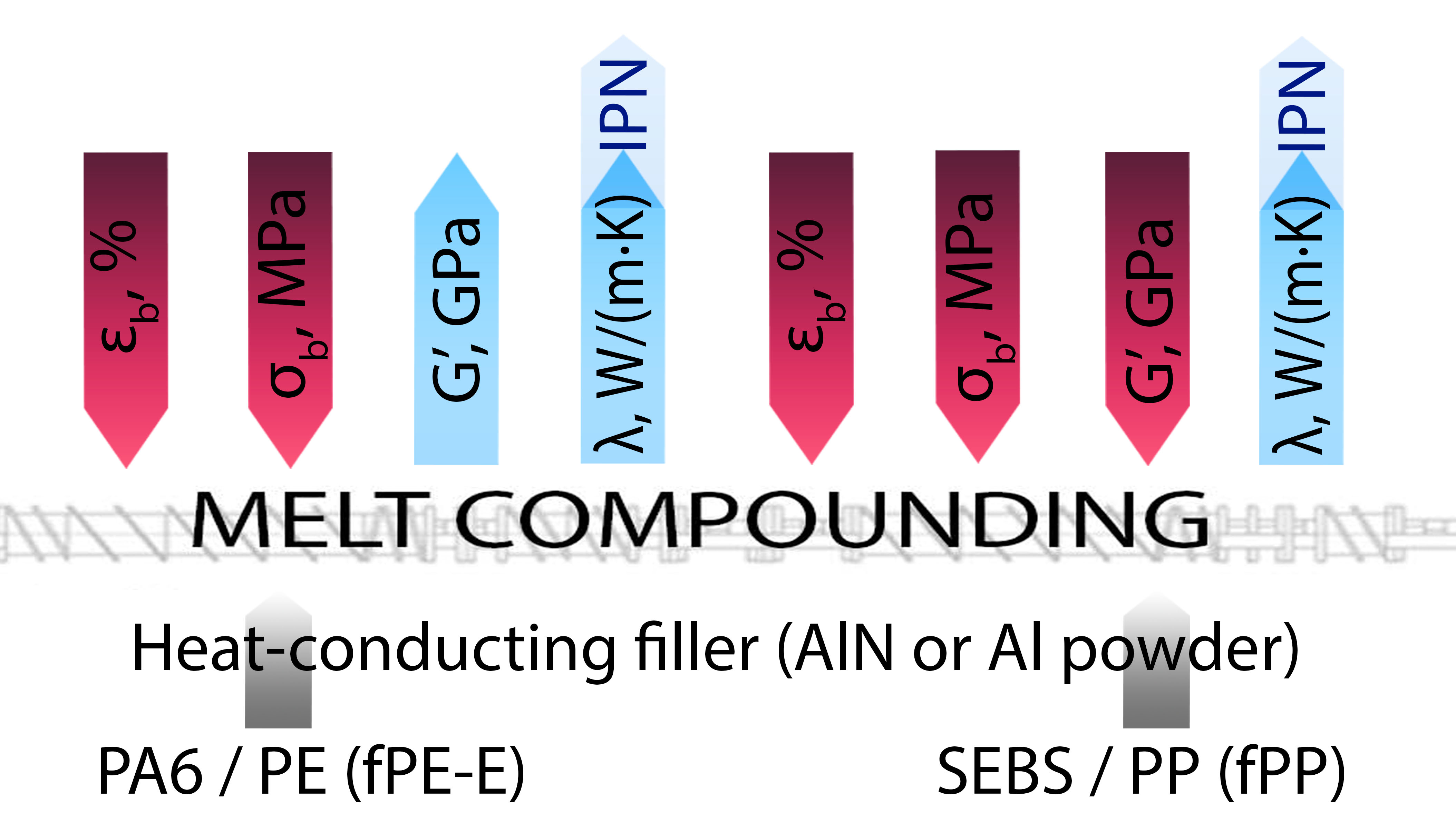 The structure and physical-mechanical properties of non-compatibilized and compatibilized blends of polyethylene with polyamide 6 and polypropylene with styrene-ethylene-butadiene-styrene, containing heat-conducting modifiers (aluminum and aluminum nitride) in their composition, were studied. Data were obtained on the influence of the ratio of polymer components in the blend and the functionalization of one of them, as well as the type of heat-conducting filler, on the mechanical and dynamic mechanical properties of composites and their thermal conductivity. Using SEM, no selective distribution of aluminum and aluminum nitride in the two-component polymer matrix was found when composites were obtained by extrusion compounding. It was found that the reinforcing effect of the filler (change in shear modulus) is largely determined by the presence of a polar polymer in the blend matrix. Both heat-conducting modifiers affect the position of the glass transition temperature maxima of the polymers used. The prospect of creating an interpenetrating polymer network structure to achieve additional thermal conductivity gain while maintaining the proportion of the conductive modifier is demonstrated.