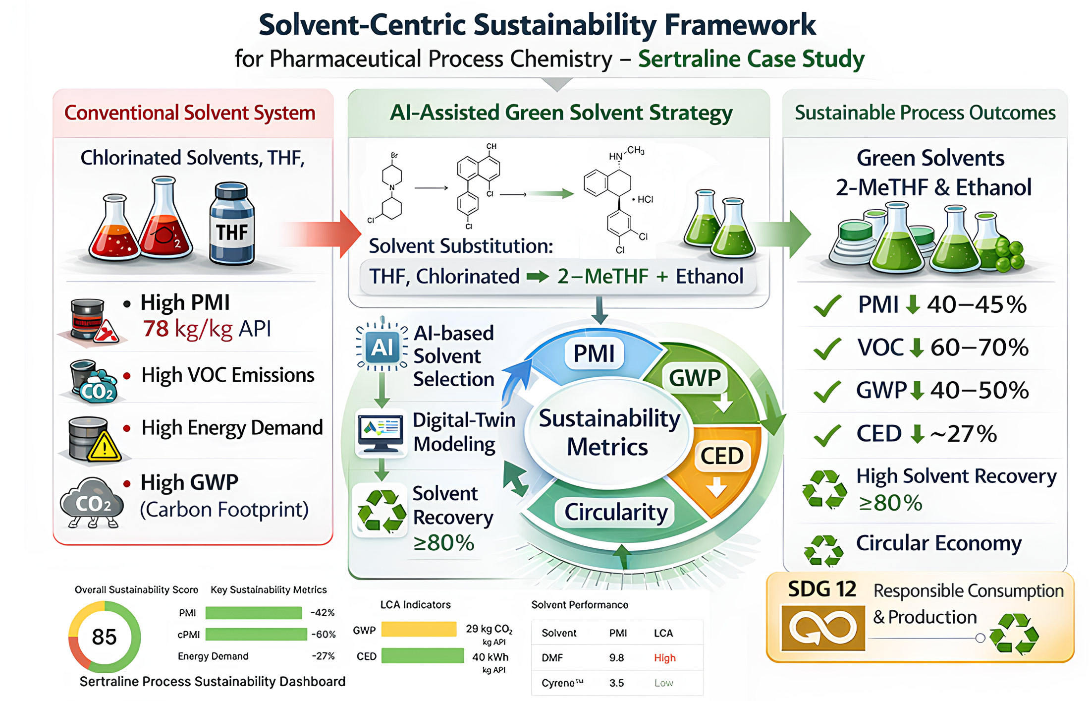Solvents dominate mass input, energy demand, and environmental impact in pharmaceutical manufacturing, yet solvent selection and recovery are often evaluated using fragmented or non-comparable metrics. Here, we present a solvent-centric sustainability framework that integrates mass-based indicators with life-cycle and energy metrics to enable transparent comparison of conventional and redesigned solvent systems. The framework harmonizes Process Mass Intensity (PMI), circular PMI (cPMI), Global Warming Potential (GWP), and Cumulative Energy Demand (CED) within consistent cradle-to-gate system boundaries, supported by literature-derived data, machine-learning (ML) models, and digital-twin–based sustainability assessment tools. The methodology is demonstrated using Sertraline as a representative solvent-intensive active pharmaceutical ingredient (API). A simplified, literature-based synthesis route contextualizes solvent use across key reaction and isolation steps. Targeted solvent substitutions—most notably replacement of tetrahydrofuran, chlorinated solvents, and dipolar aprotic media with 2-methyltetrahydrofuran and ethanol-based systems—are evaluated alongside enhanced solvent recovery and catalytic hydrogenation. Relative to the solvent-dominant subsequence of the synthesis (PMI ≈ 78 kg·kg−1 API), for which detailed solvent mass-balance data are available, the redesigned solvent strategy reduces PMI to approximately 45 kg·kg−1 API, achieves a cPMI of 6–10 at ≥80% solvent recovery, and consistently decreases GWP and CED. By explicitly mapping solvent redesign outcomes to the 12 Principles of Green Chemistry, this study demonstrates how solvent-focused interventions, supported by predictive digital tools with excellent agreement between modelled and empirical trends, can deliver substantial sustainability improvements without modifying the underlying synthetic route or relying on proprietary process data. While not intended as an industrial benchmark, the Sertraline case study illustrates how harmonized metrics, life-cycle thinking, and AI-enabled digital assessment can support evidence-based solvent selection and sustainability-oriented process development in API manufacturing.