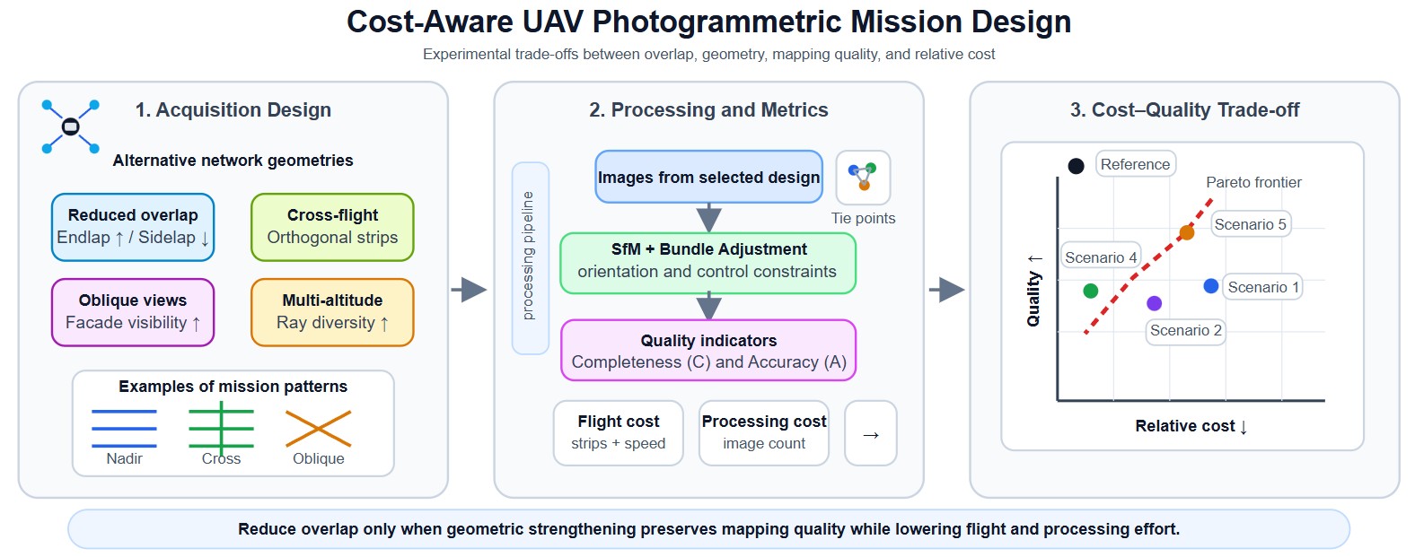 Unmanned Aerial Vehicle (UAV) photogrammetry enables high-resolution mapping and 3D reconstruction, yet operational and processing costs often scale rapidly with conservative mission designs (e.g., high overlap and redundant geometries). This paper presents an experimentally validated, cost-aware network-design study that quantifies cost–quality trade-offs in urban UAV photogrammetry. Five mission strategies—reduced sidelap with increased endlap, cross-flight compensation, partial high-overlap calibration, multi-altitude acquisition, and oblique cross-flight integration—are evaluated using a controlled experimental campaign over two urban test areas (2 × 20 ha), comprising 98 test blocks with overlaps ranging from 60% to 95%, sidelap from 20% to 80%, image counts from 70 to 2961, 7 check points, 15–17 ground control points, and GSD values between 2.6 cm and 4.6 cm, including nadir, oblique, cross-flight, and multi-altitude imagery. Each configuration is assessed using three indicators: (i) cost (flight and processing cost proxies), (ii) completeness, quantified by the number of reconstructed tie points, and (iii) accuracy, defined as a combined image–ground error at check points. Results show that cost reductions of over 50% in both flight and processing proxies can be achieved under the tested conditions while maintaining checkpoint accuracy comparable to a high-overlap reference configuration, provided that reduced overlap is compensated by stronger network geometry (e.g., cross-flight and/or oblique views). The analysis highlights product-dependent recommendations: vector map (MAP) generation can remain reliable even with very low sidelap (down to approximately 20%) when supported by adequate longitudinal overlap, whereas ortho-image mosaic (OIM) production requires at least moderate overlap in both directions (typically ≥60% endlap and sidelap) to ensure radiometric and geometric consistency. In contrast, dense 3D mesh reconstruction demands substantially stronger network geometry, including cross-flight and oblique imagery in addition to nadir views, with overlap levels exceeding 60% and preferably approaching 80%. These findings provide practical mission-planning guidelines that support efficient autonomous and semi-autonomous UAV mapping workflows.