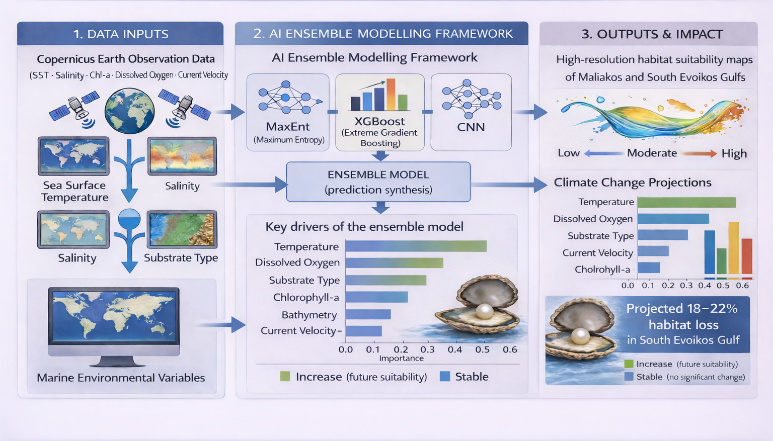 Semi-enclosed coastal systems are highly dynamic environments where benthic organisms are exposed to strong hydrographic gradients and increasing anthropogenic pressures. This study assessed the habitat suitability of the pearl oyster Pinctada radiata in two contrasting Mediterranean gulfs of Central Greece, the Maliakos and the South Evoikos, by integrating Copernicus Earth Observation (EO) products with an Artificial Intelligence (AI) modeling framework. Environmental variables, including sea surface temperature, salinity, chlorophyll-a concentration, current velocity, and dissolved oxygen, were derived from satellite and marine datasets and used to train a multi-algorithm ensemble combining Maximum Entropy (MaxEnt), Extreme Gradient Boosting (XGBoost), and a Convolutional Neural Network (CNN). The ensemble model showed strong predictive skill (AUC = 0.94; TSS = 0.80) and identified temperature, dissolved oxygen, and substrate type as the main drivers of habitat suitability. Spatial projections indicated that roughly two-thirds of the study area currently supports favorable conditions for P. radiata, particularly in shallow, low-energy, mesotrophic zones. Under a simulated +2 °C warming scenario, highly suitable habitats declined by about 20%, highlighting the species’ sensitivity to future thermal stress and subsequent oxygen depletion, demonstrating the value of EO-driven AI approaches for anticipating ecological change in vulnerable coastal systems.