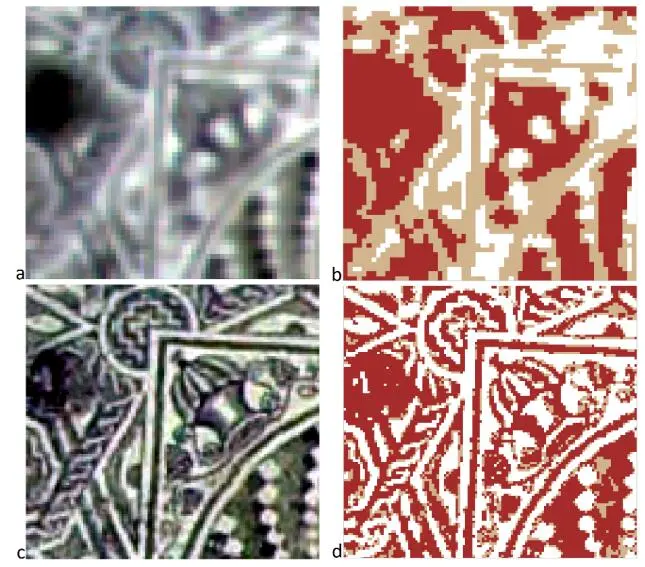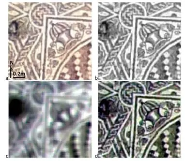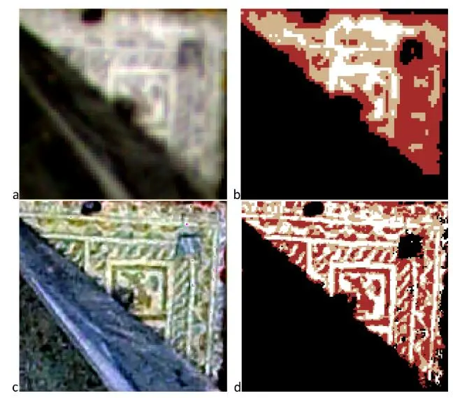 . Excerpt of the mosaic of the through of . (a) Excerpt of RGB Phantom's RGB orthophoto mosaic; (b) Excerpt of the PPAN image of RGB Phantom; (c) Excerpt of the MS orthophoto mosaic (bands: R, RedEdge, NIR) of Sequoia+; (d) Ex-cerpt of the fused image (PCA2: R, PCA3: RedEdge, PCA4: NIR).