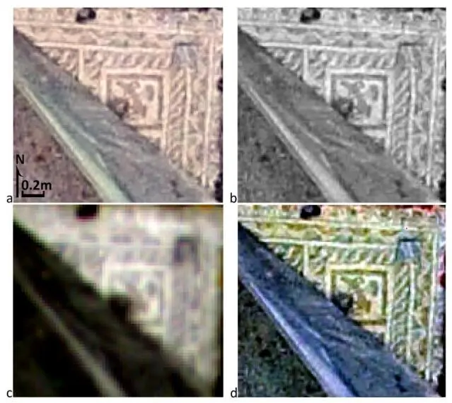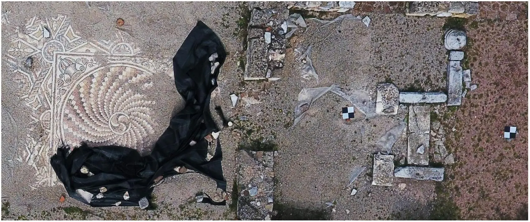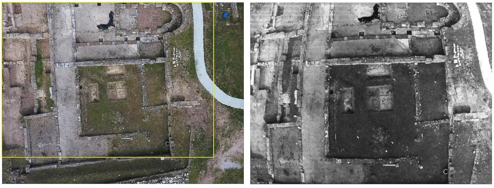. RGB Phantom image excerpt. On the left, the mosaic of the through of the temple, part of which will be depicted in the chapter of the production of the fused image. On the right, the paper targets of GCPs and CPs measuring 24×24 cm.