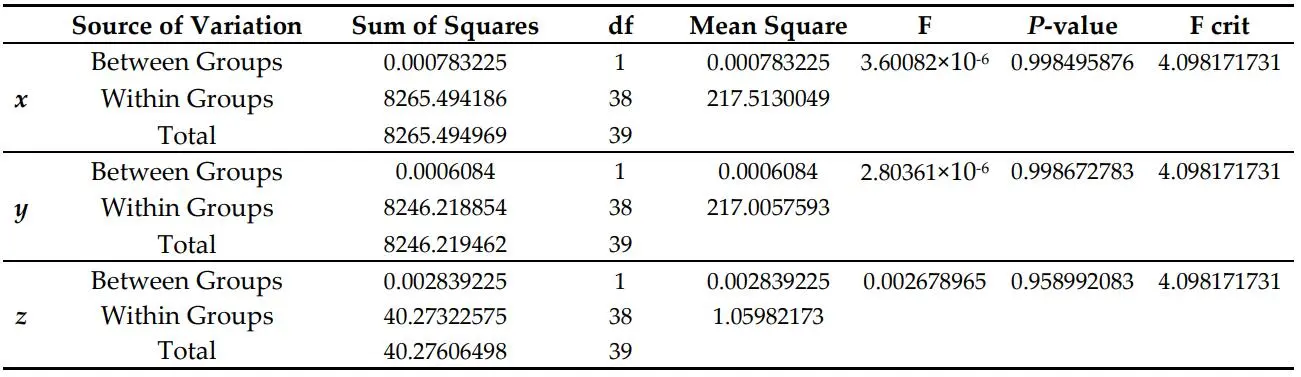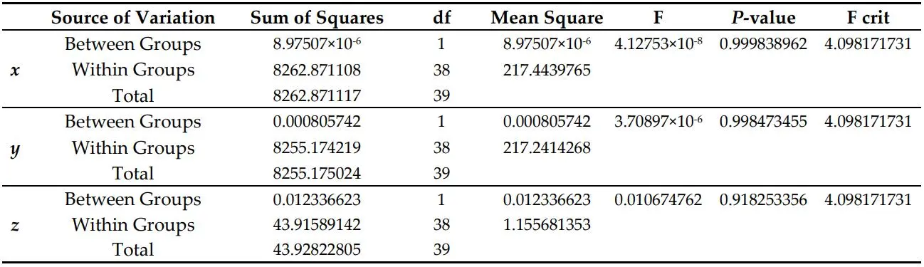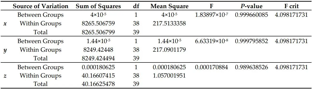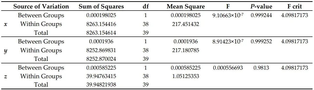 . ANOVA. Comparison of Χ and Χ’, Υ and Υ’, Ζ and Ζ’ of CPs MS Sequoia+, flight height 45 m.