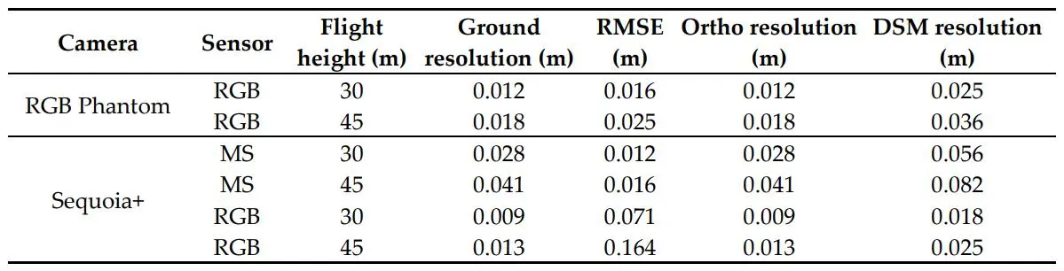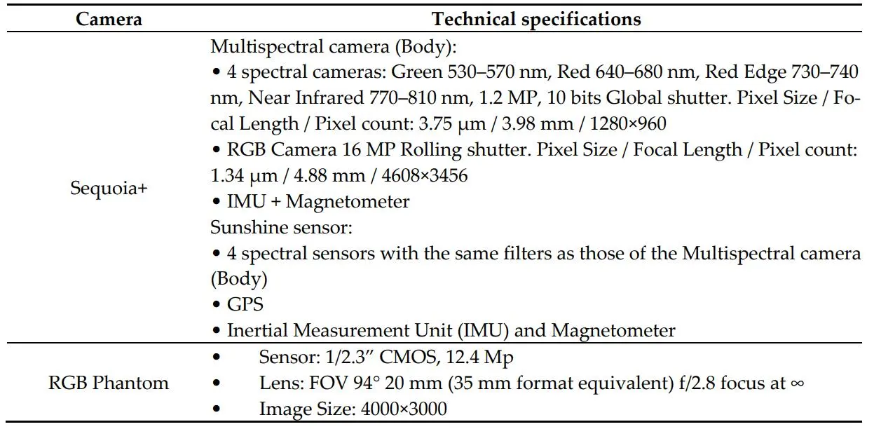 The Phantom 4 was used for mapping, which is equipped with the RGB camera 1/2.3" CMOS 12.4Mp (from now on the camera will be called RGB Phantom). The Sequoia+ camera (by Parrot) was also mounted on the UAV at the same time. The main characteristics of the two cameras are presented in .