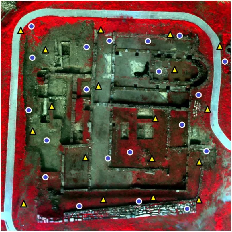. Distribution of GCPs (symbol: triangle) and CPs (symbol: circle) (Sequoia+ MS orthophoto mosaic background, bands: G, R, NIR).