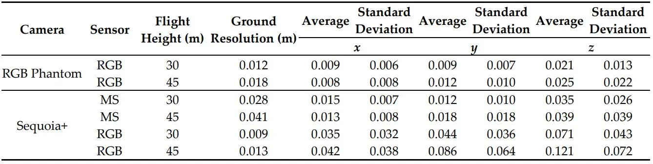 ©) extract the coordinates (X’, Y’, and Z’) of the CPs. This then allowed their comparison with the X, Y, and Z coordinate values of the corresponding CPs measured by GPS in the field. Thus, on the one hand, it was determined whether the final products were accompanied by systematic or random errors (–) and, on the other hand, the mean values and standard deviations of the differences ΔX, ΔY, and ΔZ ( and ) were calculated for both flight heights.
