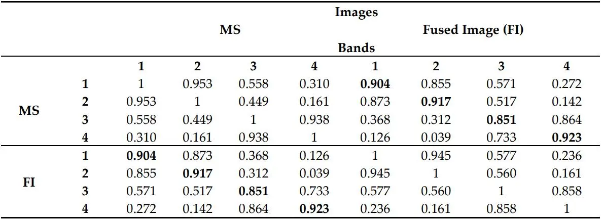 Subsequently, the histogram of the PPAN orthophoto mosaic was adjusted to the histogram of the MS orthophoto mosaic from Sequoia+ (flight height 30 m). The fused image ( and ) was created using Principal Component Analysis (PCA) technique. In terms of the output produced, any fused image B*h should be as identical as possible to the image Bh that the corresponding sensor would observe with the highest resolution h, if existent. So, the correlation table () of the original MS orthophoto mosaic with fused image revealed the retention rate of the original spectral information (which should be >90%, i.e., >+0.9) [