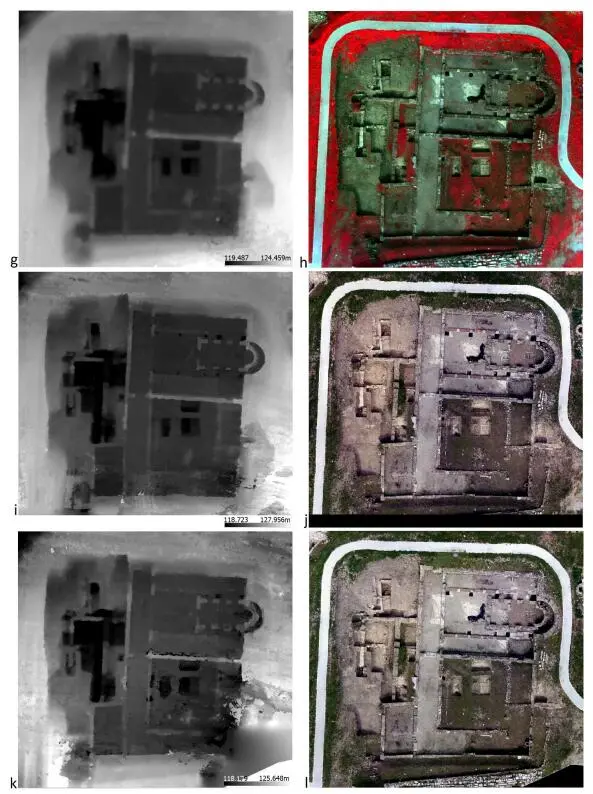 . (g) DSM and (h) MS orthophoto mosaic (bands: G, R, NIR) of Sequoia+, 45 m flight height; (i) DSM and (j) RGB ortho-photo mosaic of Sequoia+, 30 m flight height; (k) DSM and (l) RGB orthophoto mosaic of Sequoia+, 45 m flight height.