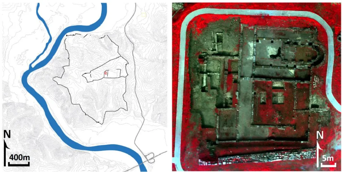 . On the left, the wider area of ancient Amphipolis: in light gray the contour curves (relief), in dark gray the modern road network, in black the walls of the ancient city and in red in the center of the left figure the position of Early Christian Basilica III. Right the MS orthophoto mosaic from Sequoia+ (bands: G, R, Near-infrared-NIR) of the Early Christian Basilica III and the adjacent Roman buildings.