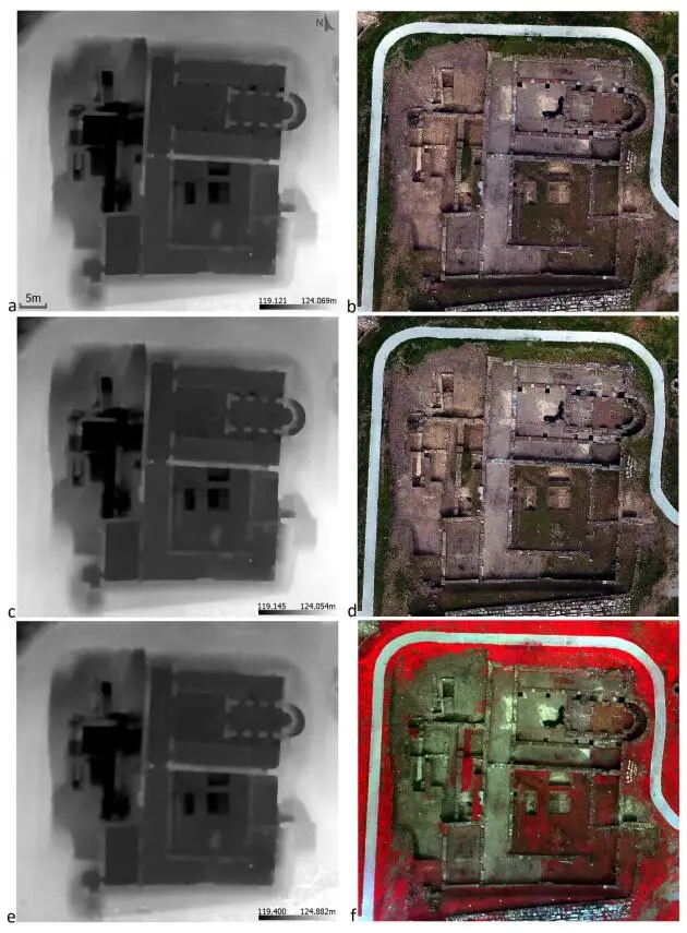 . (a) DSM and (b) RGB orthophoto mosaic of RGB Phantom, 30 m flight height; (c) DSM and (d) RGB orthophoto mosaic of RGB Phantom, 45m flight height; (e) DSM and (f) MS orthophoto mosaic (bands: G, R, NIR) of Sequoia+, 30m flight height).
