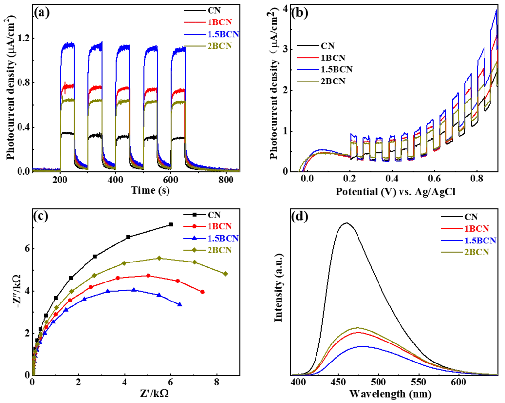 Generally, the arc radius on the EIS diagram indicates the charge transfer resistance, and a smaller arc radius means a lower charge transfer resistance. As shown in c, the arc radius of EIS of 1.5BCN sample is significantly smaller than that of EIS of other samples, indicating that the interface charge transfer resistance of the electrode obtained after treatment is smaller, which can effectively promote the transport and separation of photogenerated carriers in the catalytic reaction [
