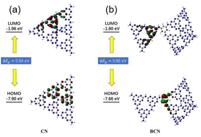 Based on density functional theory (DFT), Gaussian 09 Version E.01 was used to simulate the electronic structures of CN and BCN. The molecular structural optimization was carried out using M06-2X/def-TZVP theory level. The highest occupied molecular orbital/lowest unoccupied molecular orbital (HOMO/LUMO) was obtained with M06-2X/def2-TZVP theory level. The excited state calculations were performed by using M06-2X/6-311G** for the balance of accuracy and cost. [