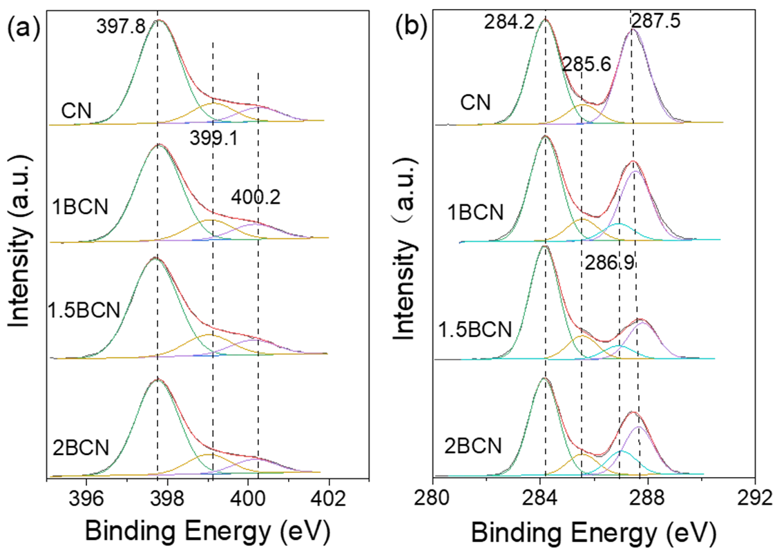 X-ray photoelectron spectroscopy (XPS) analysis was carried out to understand the chemical state and chemical composition of the photocatalysts. XPS survey spectra in Figure S1a demonstrated that there appeared the C 1s, N 1s, O 1s signals for CN, 1BCN, 1.5BCN, 2BCN. No Br signals were detected in high-resolution Br 1s spectra for BCN catalysts, as presented in Figure S1b. High-resolution N 1s spectra in a can be fitted into three peaks with binding energies at 397.8 eV, 399.1 eV, and 400.2 eV, ascribing to the sp