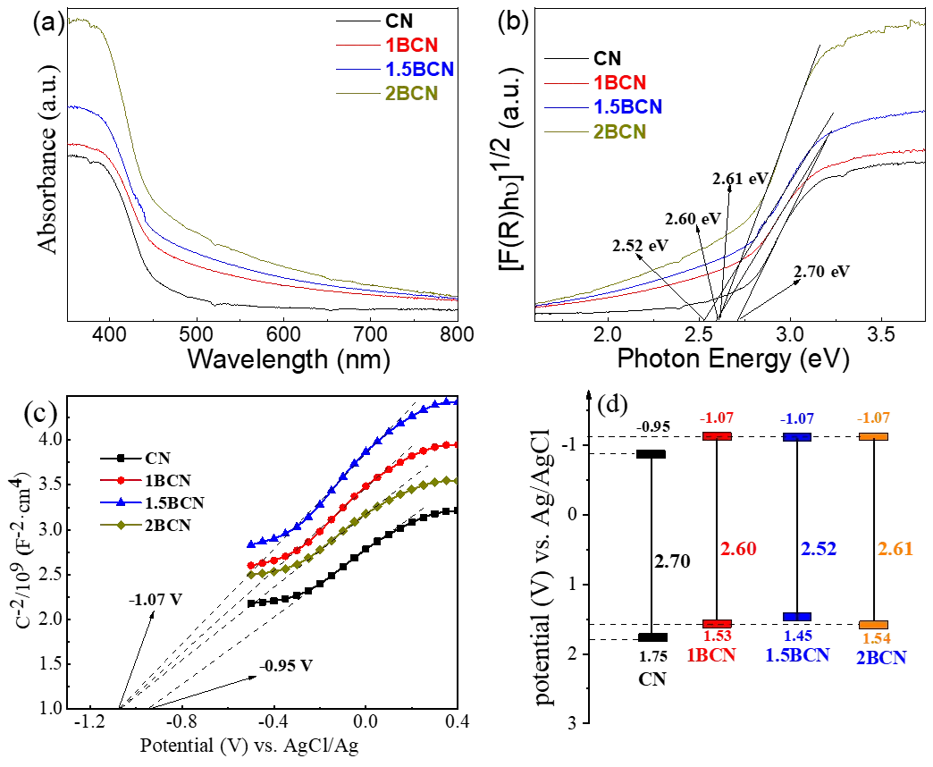 Mott-schottky measurements in c show that the flat-band potential is −1.07 eV and −0.95 eV, for BCN and CN, which indicates that the conduction band is at −1.07 eV and −0.95 eV for BCN and CN, respectively. The valence band can be calculated according the measured bandgap. The band structure is schematically illustrated in d. Compared with CN, the BCN with narrowed bandgap and more negative conduction band promotes the photocatalytic efficiency.