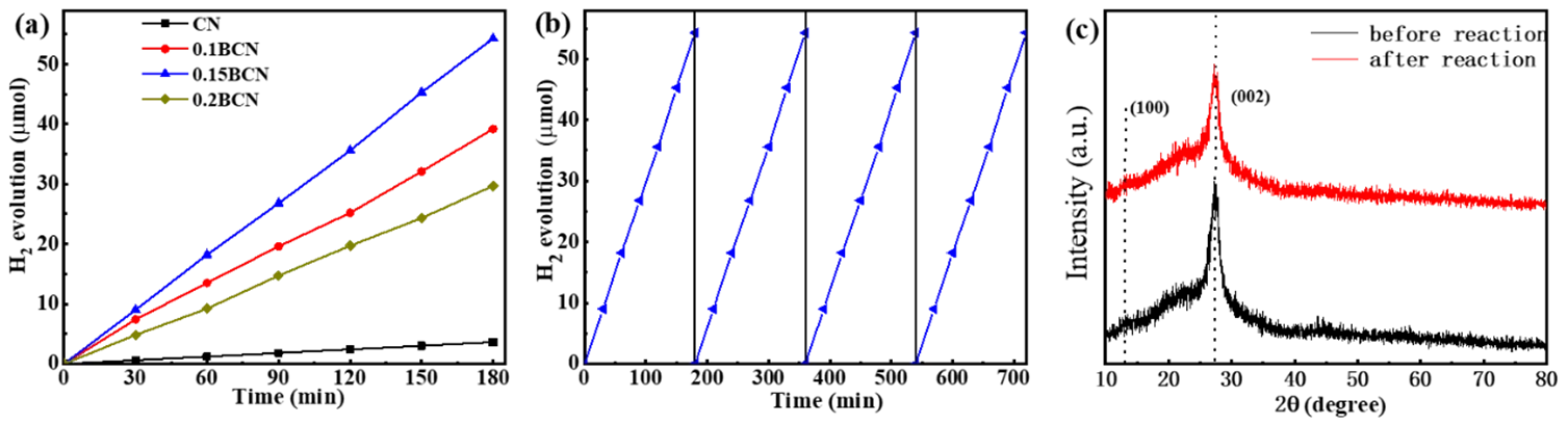 . Photocatalytic hydrogen evolution (a) of CN, 1BCN, 1.5BCN, 2BCN. Stability test of 1.5BCN (b). XRD patterns of 1.5BCN before and after reaction (c).