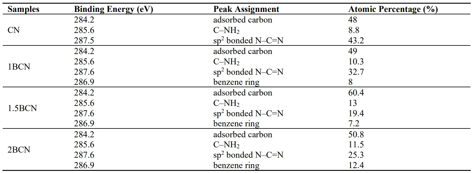 37]. The component ratio of C 1s peaks is listed in . The ratio of benzene ring to N–C=N is 24.3%, 36.6%, and 49.1%, for 1BCN, 1.5BCN, and 2BCN, respectively. These results demonstrated that benzene ring was introduced successfully in g-C