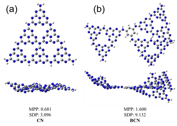 50]. An interesting phenomenon can be found that CN has a structure similar to a “small bowl” after optimization, as shown in a. Introducing benzene ring as a linkage via C–N=C in BCN enhances the curvature of the molecular conjugate structure measured by molecular planarity parameter (MPP) and span of deviation from plane (SDP) [