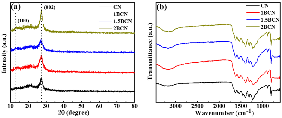 . XRD patterns (a) and FTIR spectra (b) of pure CN and BCN.