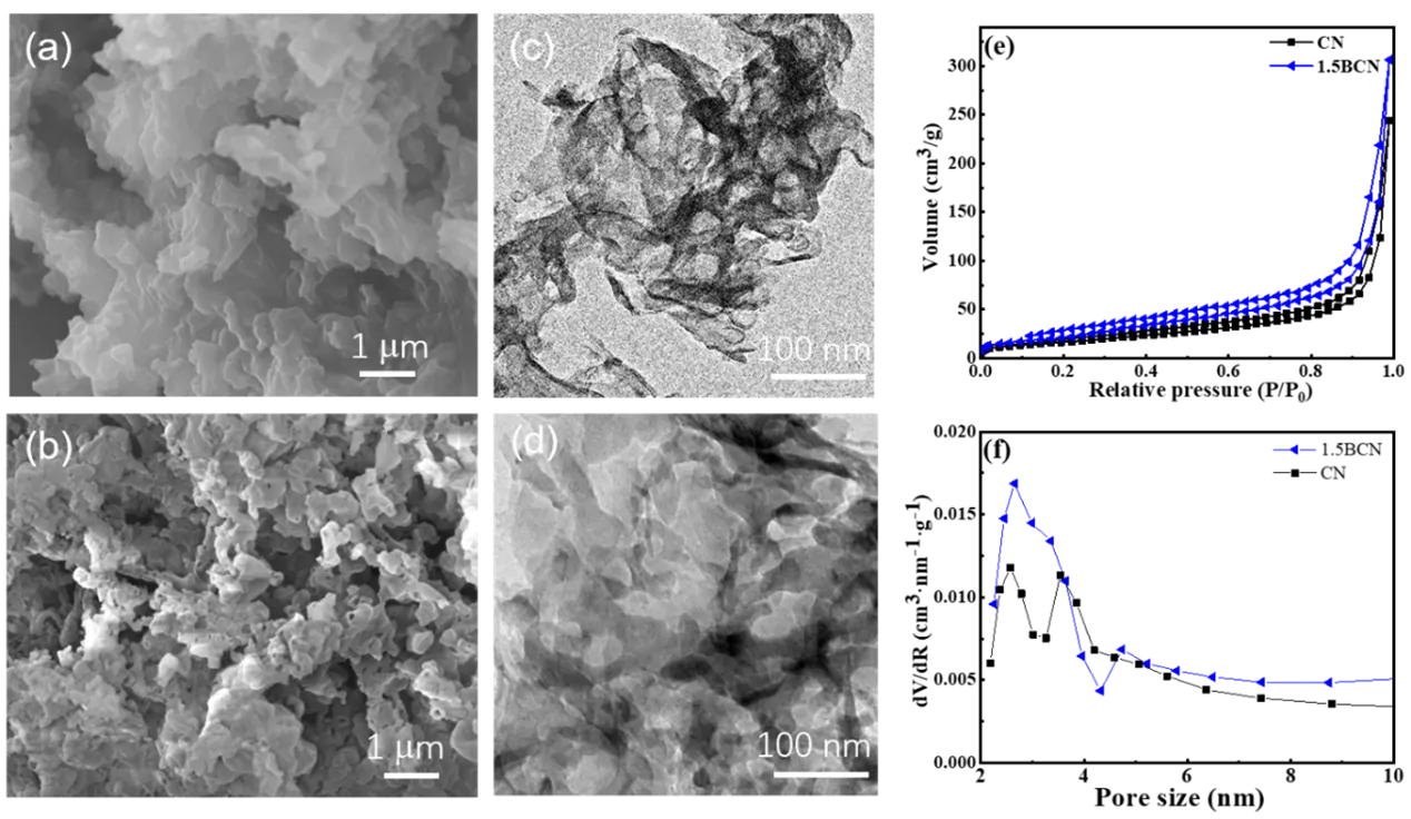 . SEM images of pure CN (a) and 1.5BCN (b). TEM images of pure CN (c) and 1.5BCN (d). N2 adsorption-desorption isotherms (e) and pore distribution (f) of CN and 1.5BCN.