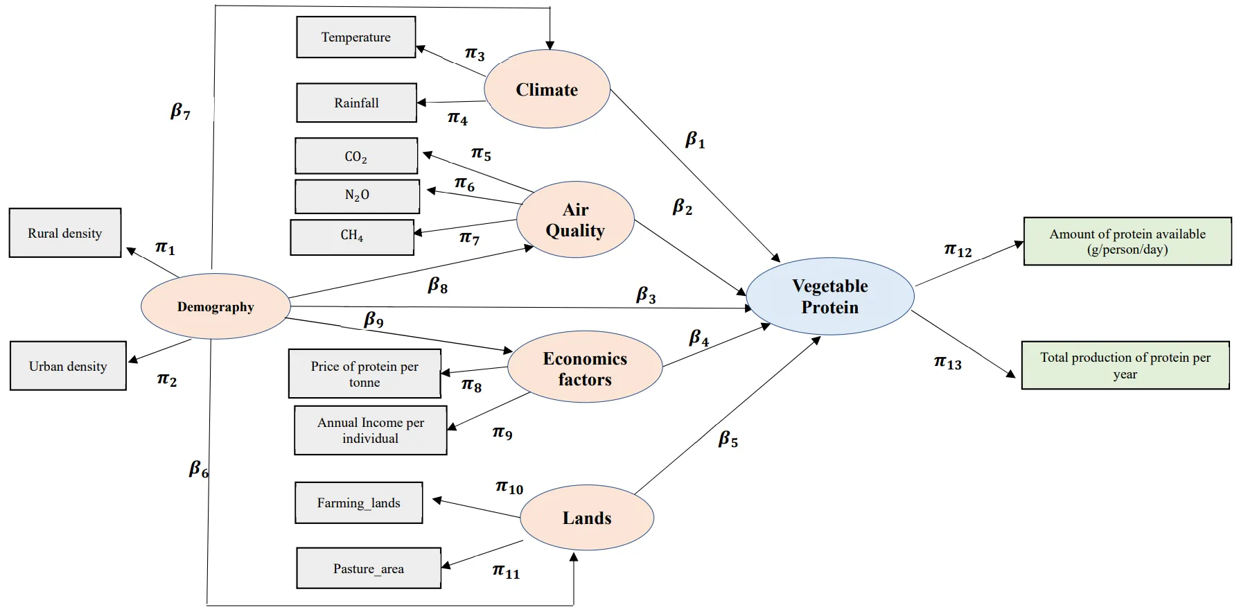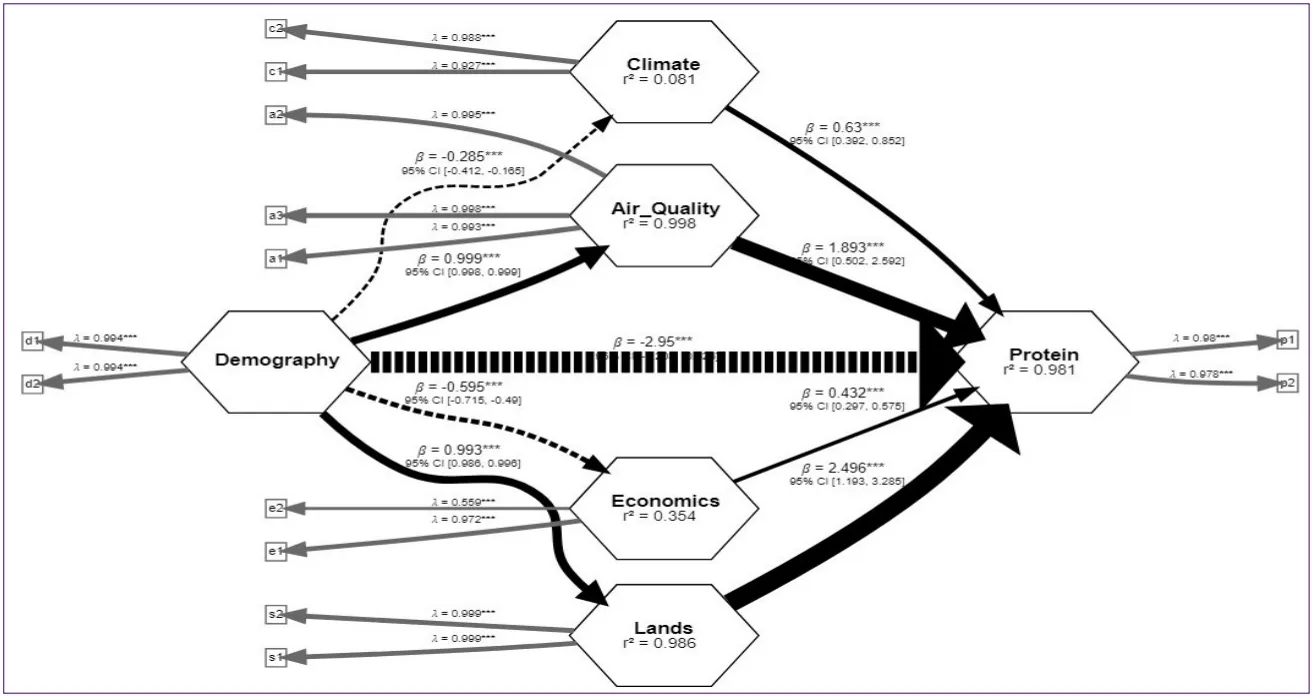 43]. To identify the determinants of protein availability at the individual level in various countries, structural equation modeling (SEM) was employed, based on partial least squares (PLS-SEM). This approach, combining factor analysis and regression, specifies regression equations describing the relationships between latent factors, providing greater precision through the simultaneous management of relationships between many variables and the consideration of measurement error [