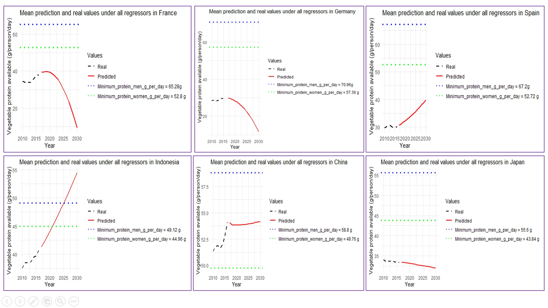 48]. At European country level, analysis of the results of the prediction of the amount of plant protein that would be available to an individual shows a decreasing trend over time, particularly in France and Germany, where by 2030, forecasts indicate a gradual reduction to 10 g/person/day of plant protein. In Spain, on the other hand, forecasts suggest an increase in the amount of protein consumed by individuals to 40 g/person/day. Nevertheless, in these various European countries, including Spain, the amount of plant protein available to individuals will remain insufficient to meet the protein needs of the inhabitants of these countries.