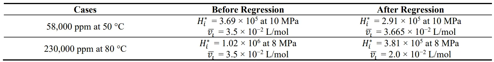 Hi∗ and $$\overline{v_i}$$ can be adjusted to better fit the experimental solubility data and address any discrepancies in the model predictions. In this study, two levels of solubility were considered: 58,000 ppm at 50 °C [