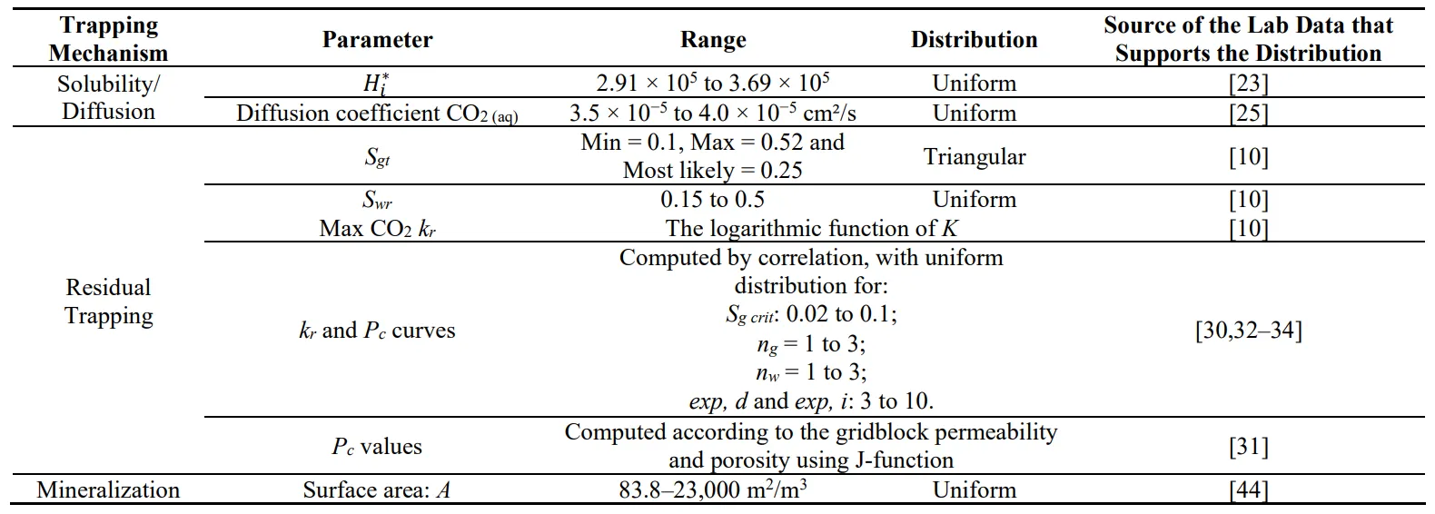 2 trapping mechanisms, including solubility, residual, and mineral trapping. This is achieved by leveraging lab data to establish distributions and relationships between parameters and geological properties. This unique approach sets our study apart from other studies conducted by different authors [