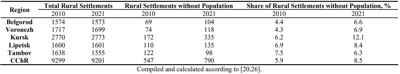 . Rural settlements of the Central Chernozem region (CCR) “without population” in 2010 and 2021.