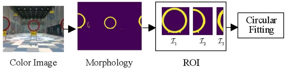 Gates are made of wood with red paint on the surface. The proposed ring-shaped gate target detection process is shown in . In the first place, the image I is converted from the RGB color space to the HSV color space. Next, a binarization image is extracted through color filtering. Subsequently, morphological processing is employed to eliminate some noises, and divides image I into several sub-images I