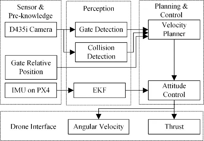 The software architecture is shown in . The sensor and pre-knowledge part provide the current information and vague information about the environment already known. Then, information is extracted via the navigation algorithms. The velocity planner generates velocity commands to pass through gates to avoid collision and explore invisible gates. The IMU on PX4 is used to estimate velocity via an EKF estimator. The velocity-controlling scheme is implemented with proportional attitude control and throttle control.