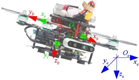 . The autonomous platform used for real-world flight. The red arrows depictured body frame {b}; the green arrows depictured the camera frame {c} and the blur arrows depictured the earth frame {e}.