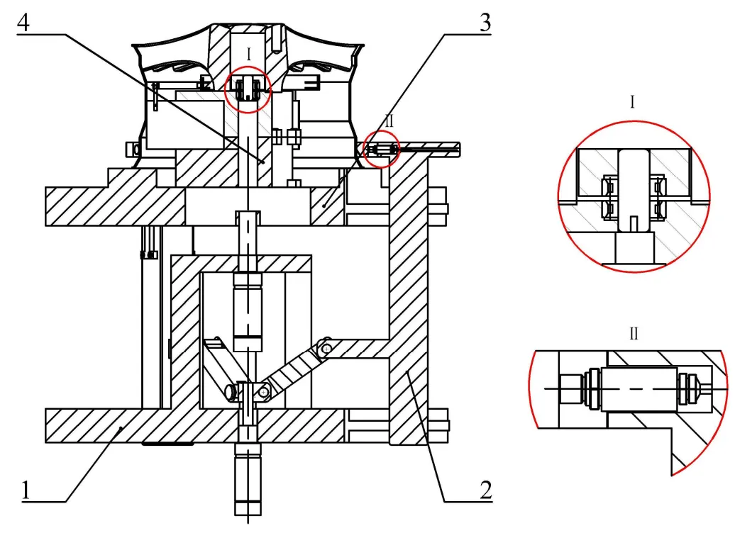 . Structure diagram of fixture. 1. Fixed platform 2. Clamping claw 3. Movable platform 4. Self-positioning device.