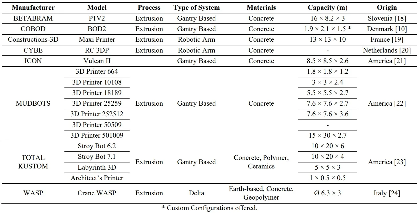 17] are three popular 3DP technologies under built-environment applications. Extrusion-based techniques, where considerable material is selectively deposited to generate a layer of selectively cut geometry, are the most popular in the built environment. This process is comparable to the fused deposition modelling (FDM) approach, in which concrete is printed using a robot, a crane, or a gantry 3D printer. Examples of a few commercially available printers are provided in .