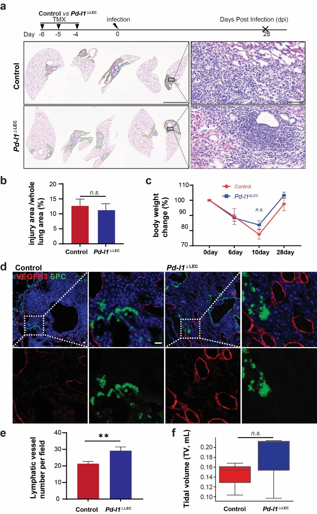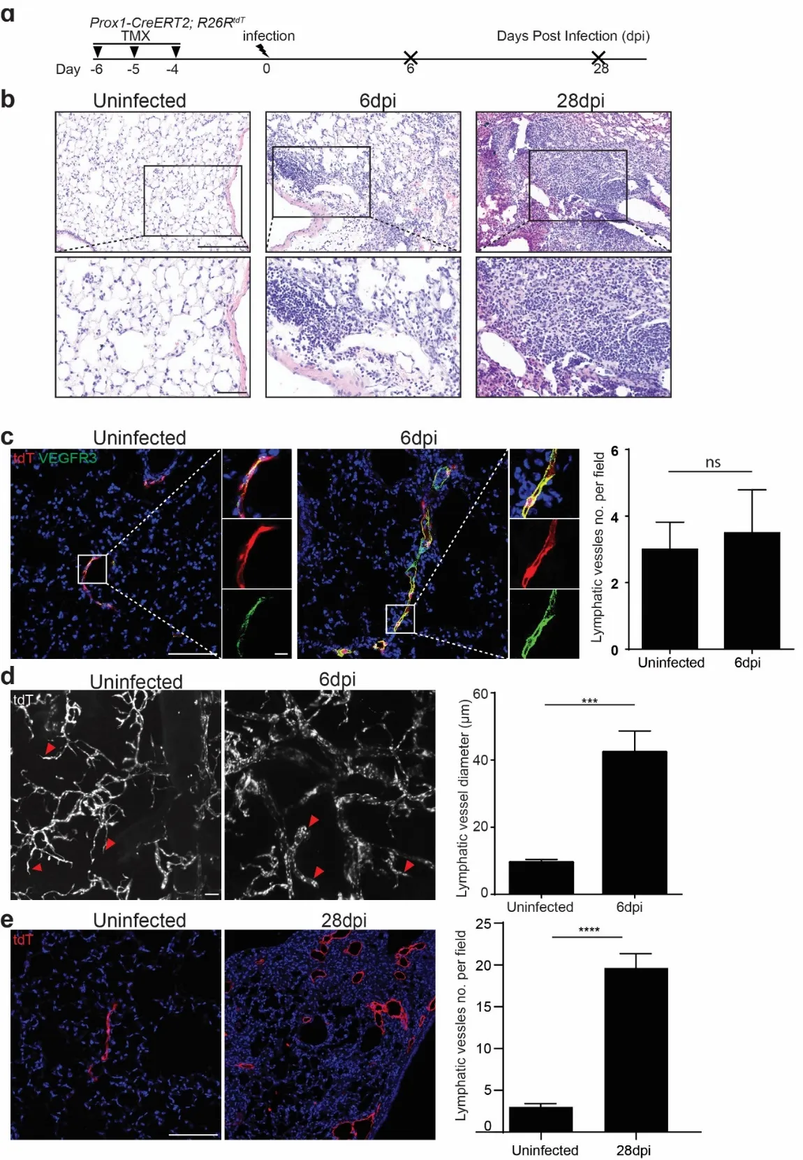 R26RtdT mice to label the LECs in the lungs, and then we challenged the mice with H1N1 influenza PR8 (a). We harvested the lungs at 6 and 28 days post-infection (dpi) (b). The lung structures were minimally changed but with increased accumulation of immune cells in the injured area at 6 dpi. In contrast, the histological changes were apparent, and the numbers of immune cells were dramatically increased in the injured area when examined at 28 dpi (b). We then used VEGFR3 as a marker for LECs, which were also positive for tdTomato (tdT), to visualize the lymphatic vessels via confocal microscopy. At the early stage of infection (6 dpi) the number of lymphatic vessels was not dramatically altered (c), while we observed a 4-fold increase in the diameters of lymphatic vessels using tissue clearing and 3D imaging of the whole lung by light-sheet microscopy (d). By 28 dpi the number of lymphatic vessels was increased by 6 folds (e), indicating a significant expansion of the lymphatic network. Together our findings demonstrated that the lymphatic vessels underwent initial dilation followed by dramatic increases in the number of lymphatic vessels. The dilation can be seen as a functional adaptation in response to viral infection, allowing for two purposes: (1) return of excess interstitial fluid to the blood to maintain tissue fluid balance; (2) transport inflammatory cells to facilitate the resolution of inflammation.