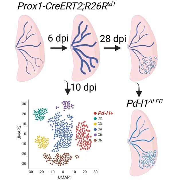 Prox1-CreER mouse line to specifically characterize the dynamic changes of the lymphatic vessels during influenza infection. Our findings delineate a distinct response of LECs to influenza infection, characterized initially by vessel dilation and subsequently by an increase in vessel numbers. scRNA-seq analysis of purified LECs further uncovered the presence of heterogenous LEC populations during infection. Our subsequent study of a