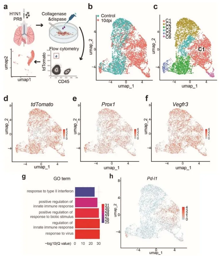. scRNA-Seq analysis identifies a PD-L1+ LEC subpopulation during influenza infection. (a) scRNA-seq experimental diagram. (b) UMAP clustering of single-cell transcriptomes of LECs purified from control (Prox1-CreERT2; R26RtdT uninfected) and virus-infected lungs. Note lung tissues were collected from Prox1-CreERT2; R26RtdT mice at 10 dpi. (c) Identification of 6 distinct LEC clusters (C1–C6) based on gene expression profiles. (d, e and f) Expression of tdTomato, Prox1 and Vegfr3 in distinct LEC clusters. (g) Gene Ontology (GO) analysis of signaling pathways enriched in cluster C1. −log10 (Q value) indicates the significance of enrichment. (h) The distribution of Pd-l1 expression across LEC populations.