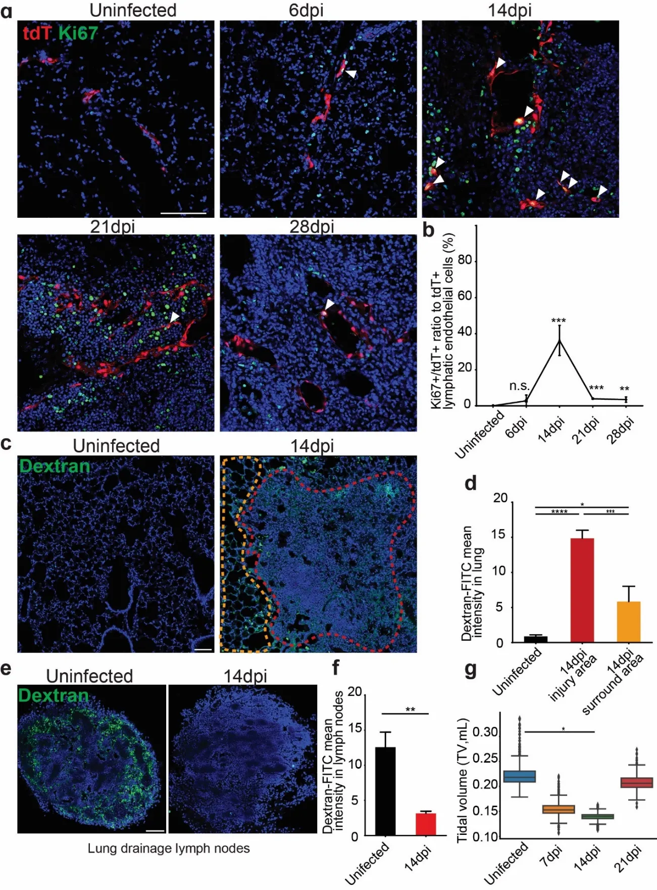 We next used dextran assays to assess whether the increased numbers of lymphatic vessels are associated with any changes in drainage, an important function of the lymphatic system (c). Intratracheal instillation of FITC-labeled Dextran was tested for uptake to the lymphatics from the interstitial. A marked increase in FITC-dextran intensity within the injured areas illustrated the compromised lymphatic drainage function (d). Notably, the FITC-dextran intensity in the injured area was significantly higher than the intensity in the surrounding uninjured areas, highlighting the localized impact of infection on lymphatic function. Consistently, the intensity is impaired in lung drainage lymph nodes after influenza infection (e,f). In addition, lung function was also impacted by the infection as we observed a gradual reduction of tidal volume, associated with the dysfunction of lymphatics at around 14 dpi (g).