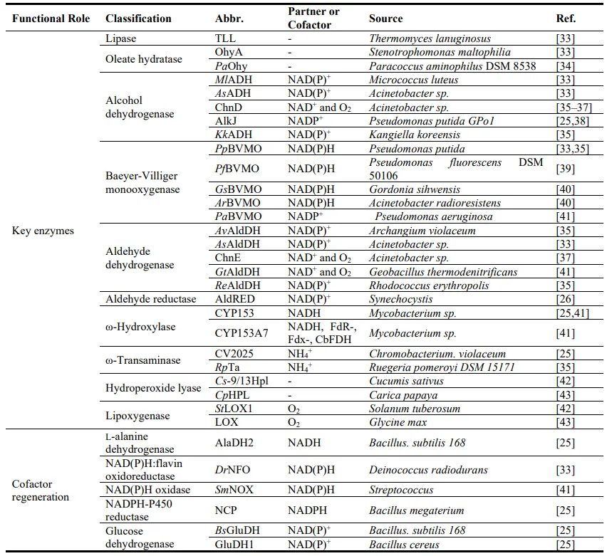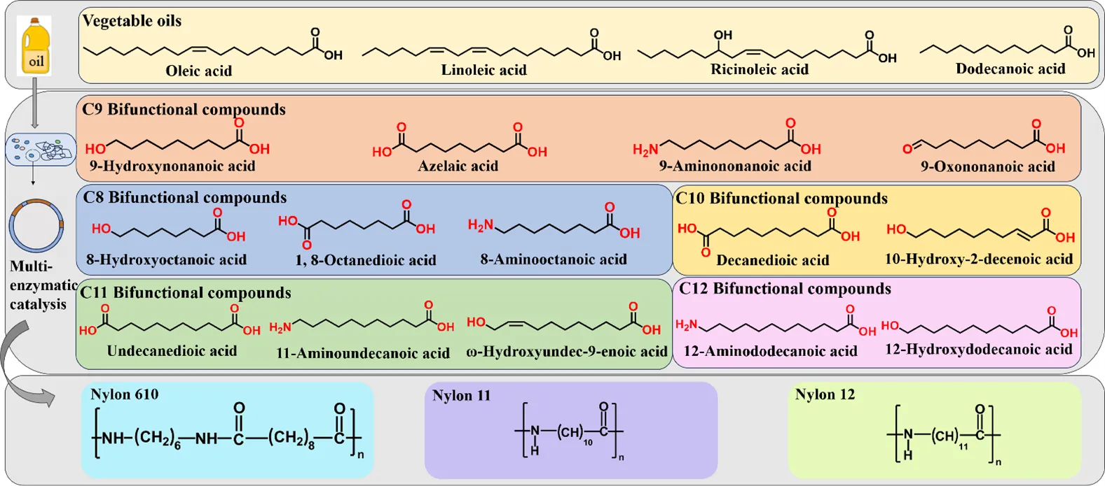 32]. Fat-derived bifunctional monomers such as ω-amino fatty acids, α,ω-dicarboxylic acids and α,ω-diamines are commonly used for synthesizing nylon. shows the key enzymes in the synthesis of C8–C12 bifunctional monomers through multi-enzyme cascade reactions.