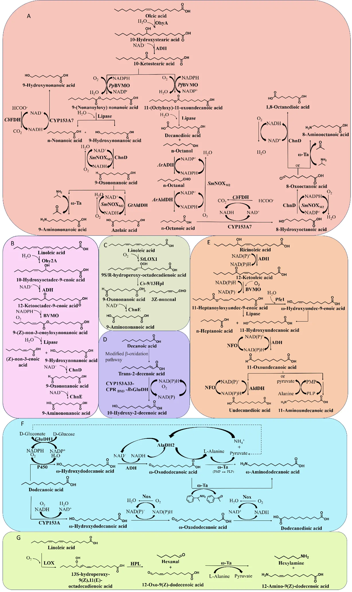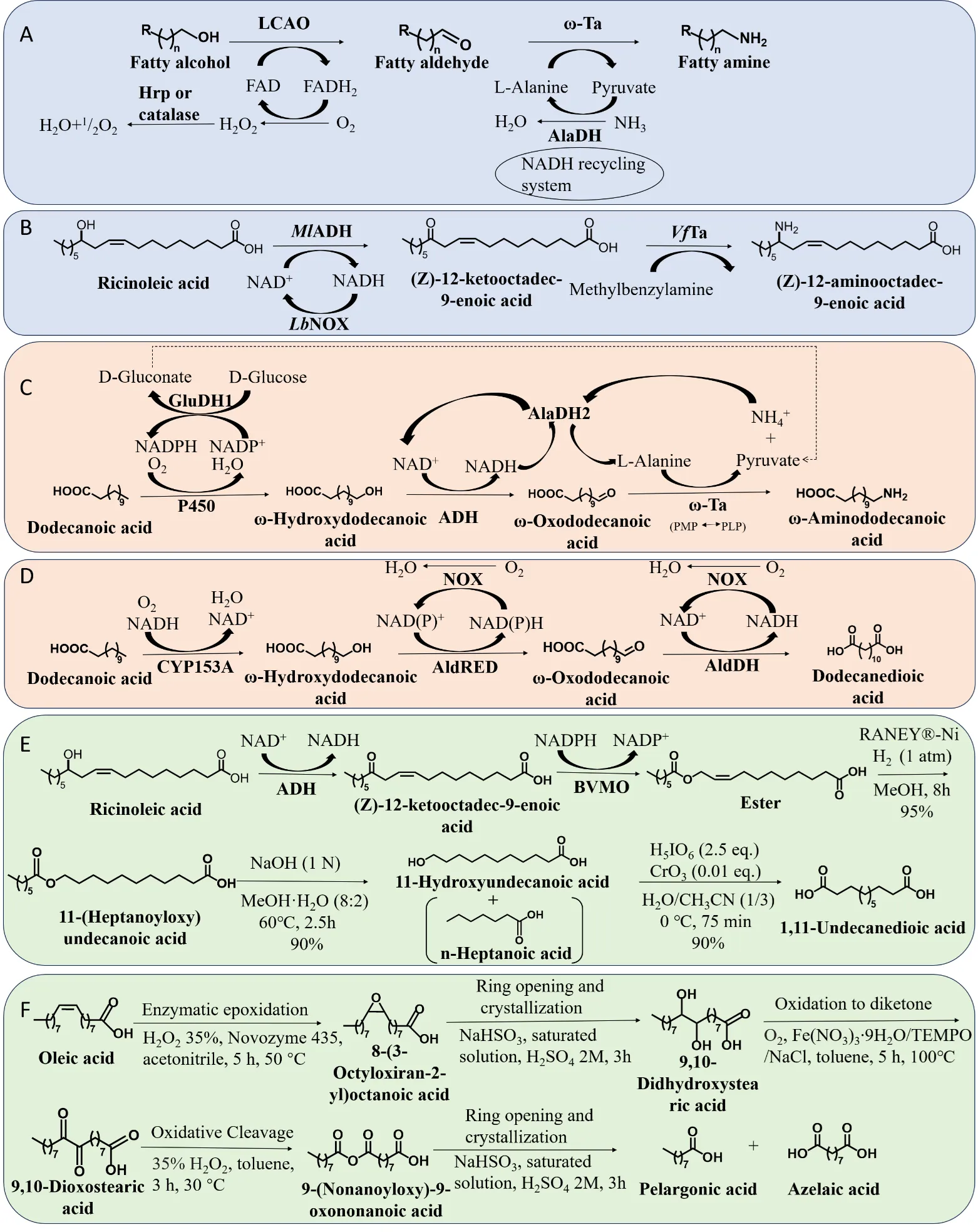. Enzymatic cascade reaction systems. (A) Preparation of fatty amines from fatty alcohols by two-enzyme catalyzed one-pot method. (B) Preparation of (Z)-12-aminooctadec-9-enoic acid from ricinoleic acid by two-enzyme catalyzed one-pot method. (C) Preparation of ω-aminododecanoic acid from dodecanoic acid by multi-enzyme catalyzed one-pot method. (D) Preparation of dodecanedioic acid from dodecanoic acid by multi-enzyme catalyzed one-pot method. (E) Preparation of 1,11-undecanedioic acid from ricinoleic acid by chemical-enzyme catalyzed one-pot method. (F) Preparation of pelargonic acid and azelaic acid from oleic acid by chemical-enzyme catalyzed one-pot method.