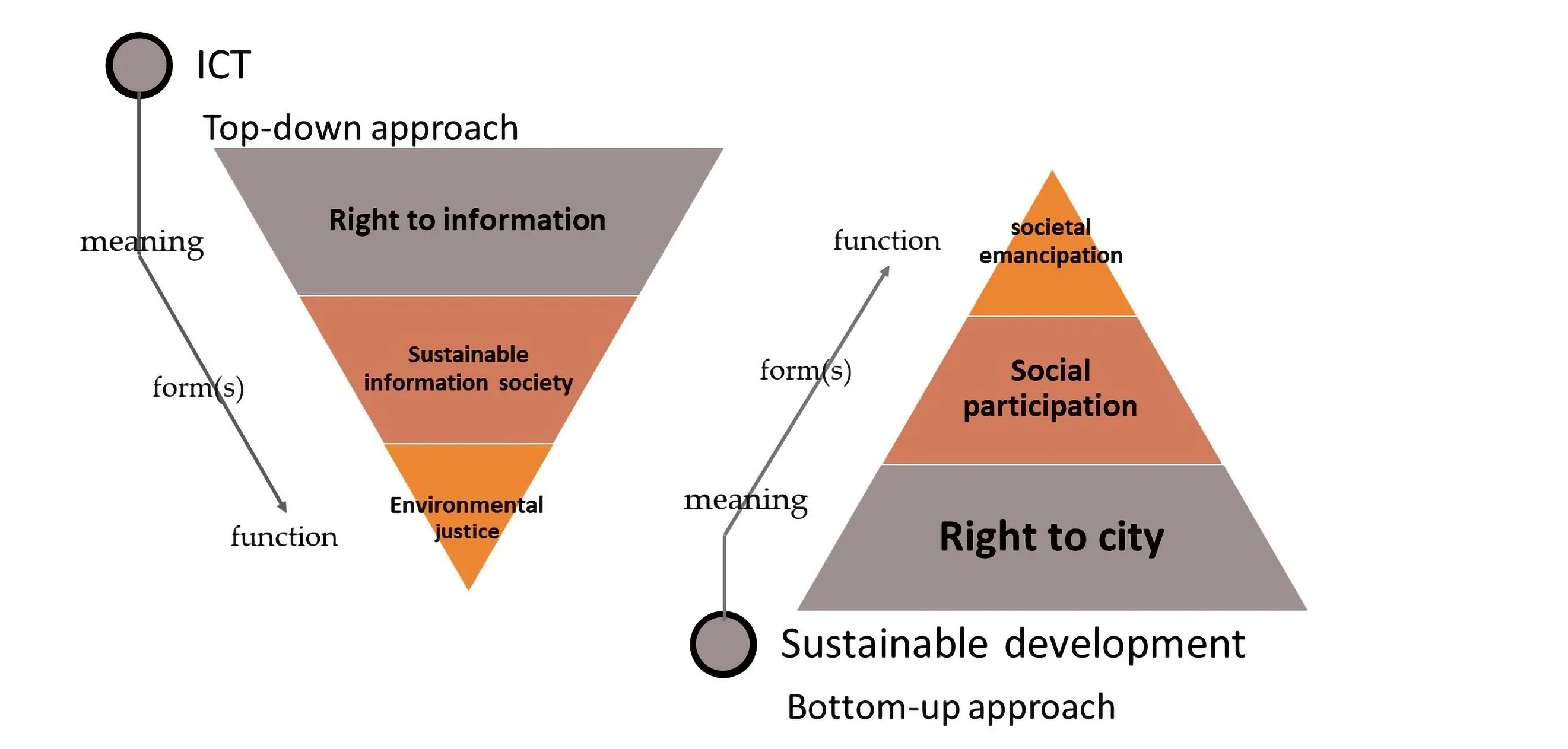 In this study, the exploration of Sustainable Development (SD) implementation revealed ICT as a transformative top-down approach facilitating the bottom-up localization of SDGs for inclusive and just sustainable cities and communities. While the practice of the Right to the City is inherently bottom-up and localized, its innovative and accountable empowerment of the voice of the unheard necessitated a preliminary top-down global approach of implementing the macro-level infrastructure for global internet access, embodied in the Right to Information. The study highlighted the critical role of accountability within the ICT framework to address challenges hindering coordinated efforts for inclusive localization, emphasizing ICT’s precedence in SDGs.