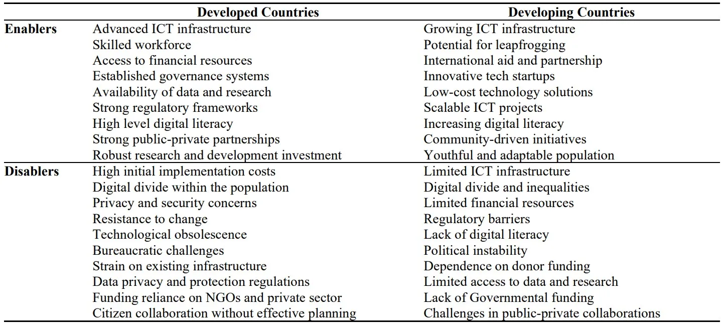 . Summary Table: Enablers and Disablers of ICT implementation for Sustainable Development: Developed vs. Developing Countries.