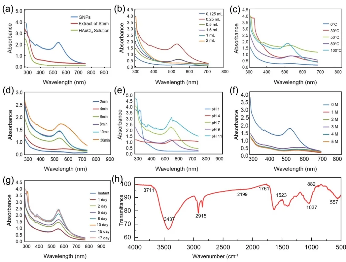 15 mL solution of 1 mM solution of HAuCl4·3H2O taken in a beaker and was neutralized by adding NaHCO3. Then 1 mL of liquid stem extract was added into it. The resulting solution was stirred continuously for 10 min and divided into 5 equal parts in five flasks. 2 mL of 1 M, 2 M, 3 M, 4 M and 5 M solution was added in each flask, respectively and changing salt concentration impacts the ionic strength and electrostatic interactions in the solution, which can influence nanoparticle aggregation and stability. After 24 h, UV-Vis spectral analysis of each solution was performed.