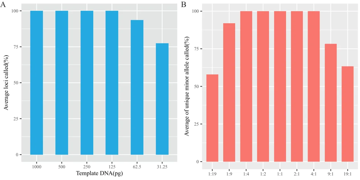 Trace DNA may be present at a crime scene, so assessing the sensitivity of the 29-plex STR multiplex system is necessary. A serial dilution test of control DNA 9948 from 1 to 0.03125 ng was conducted in triplicate. Full profiles were obtained with DNA input above 125 pg using a 50 RFU threshold. However, when the total input DNA was 62.5 pg, the call rate reached 93.6%. At 31.25 pg of DNA input, 77.4% of the loci were detected (A).